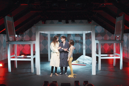 Linnateatris suisa igav ei hakanud, aga mõte läks vahepeal uitama: räägitava teksti mass kaalub kordades üles mängulise tegevuse ning narratiivi tulistatakse intensiivselt. Nii kiirelt, et ega saalis jõuagi otsida mustrilisi linke või analüüsida ühe või teise rääkija lugu. Kui vaataja pole just friikne intellektuaal, siis käib tulv üle pea. Saan aru minu ees istuvast TV staarreporterist, kes jälgib küll pingsalt, aga hakkab korduvalt nihelema ja vahib vahepeal vaikselt publikut — kuni grotesksed pöörded või tegelaste vahetused uuesti haagivad…