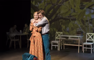 Georgi isa Jan Olav pihib, kuidas ta armus Apelsinitüdrukusse. Taavi Tõnisson mängib südamlikult. Segama hakkas isa välimus: keigarilokid ja dändi sametülikond ei sobi üldse tegelase hingeeluga. Isa mehine, tõsine olemus paotub ema maalitud portreel, mis pööningul peidus. Võib-olla on kontrast teadlik? Kaisa Selde mängib paeluva saladuslikkusega Apelsinitüdrukut, kes haldjana veetlev, kuid samas pingestatult tõsine. Nii „Kentsakas juhtumis…” kui siin pillab lavastaja mängu võõrituseviive, neljanda seina kerget läbipaistvust. Näiteks vaatavad armunud saali: „Palju inimesi — palju lapsi ka!” ja Apelsinitüdruk küsib mehelt nagu muuseas: „Palju sa lapsi tahad?”