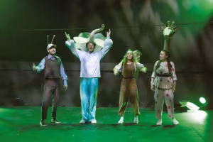 võtta ära kingad, kirjutada paberile sünnipäevasoove metsale. Ma pole algteost lugenud, aga Andri Luubi versioon tundub olevat pisuke laste-Beckett, teemaks mets, kujundus koosnemas paberist. Paberirullide seest kooruvad tegelased, paberit kägardades meisterdatakse loomi, krabinal kirjutatakse kirju. Paberit tehakse puidust — kas ei peitu siin vastuolu metsa kaitsmisega? Keegi lastest soovis metsale kingiks arvutit. Päris kirjade kirjutamine võiks olla lastele innustav. Näitlejate kvartett on sarmikas. Taavi Tõnisson (Elevant) tutvustab mängureegleid, et ei ole vaja karta hämarust ega valju häält. Laura Kukk mängib Kirjakut — küll ma imestasin, et miks elab lehm metsas; et tegu on hoopis kaelkirjakuga, sain viimaks aru tänu paberloomale. Sõpruse teemat komplitseerivad Orav (Steffi Pähn), kes kirjutab agaralt kõigile, aga vahepeal väsib ja tahab üksi olla. Sipelgas (Jevgeni Moissejenko) lisab nüansi, mis täiskasvanute keeles oleks manipuleerimine: Sipelgas lubab ära minna või teeskleb haiget, et leida sõpru.