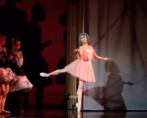 Mind jäi kummitama küsimus, miks otsustas koreograaf lavastada väga palju balleriinide koreograafiat varvaskingades. Kust varvasking üldse tuli?43 Louis XIV ajastu oma kehakasutuse muutustega on balleti sünnis ja arengus sedavõrd põnev ajajärk, et huvitavam olnuks, kui teose tantsukeel ammutanuks inspiratsiooni tolle ajastu stiilist, selle asemel et ekspluateerida balleti ja varvaskinga otsekui igavest kokkukuuluvust. Barokihõngulised liikumised olid igati nauditavad ja nende suurem kasutamine olnuks teretulnud. Ilmselt kardeti siin aga lavastuse langemist stereotüüpidesse. Nii jäidki maskiballi passepied ja sarabande kõlama kavalehe sisukokkuvõttes, mitte aga antud stseeni koreograafias. Õukonnapeo orgialikkus väljendus ajastule ebaloomulikult võimsalt avatud puusavaagnaga pas de patineurs’i tantsimisega.44 Balleti arengus on väga põnev en pointe’i kasutuselevõtmine maist ja taevalikku ühendava vikerkaaresillana, mitte aga enesestmõistetava tehnilise võttena. Kindlamad valikud selles osas oleksid toetanud lavateost (kus tegelaskujudele omistati julgelt nii maiseid kui ebamaiseid tähendusi), kehtestamaks erinevaid maailmu ning joonistamaks välja tegelaskujude kahestumist.