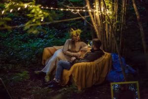 „Keha, kus elada”. Kõiki meeli haaravaks elamuseks polnudki palju vaja, peamise töö tegi ära loodus ise: lavastuse loojad olid lisanud suveööunenäolikke lambikette metsa puude otsa.
