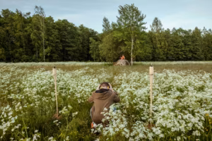 „Keha, kus elada” kogemuse isiklikkus: üks publikuliige suvisel põllul ja üks etendaja kivil.