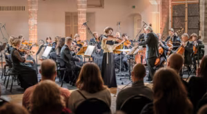 Lilli Maijala ja Tallinna Kammerorkester Juha Kangase juhatusel salvestamas Vasksi Kontserti vioolale ja keelpilliorkestrile Tallinna Mustpeade majas jaanuaris 2020.