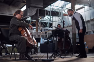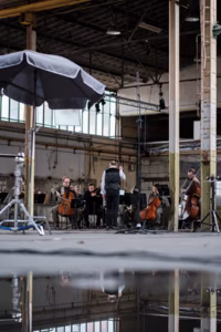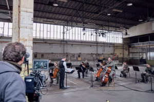 Hetki filmivõtetelt: New European Ensemble, dirigent Mihkel Kerem ja tšellist Willem Stam.