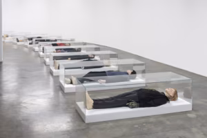 Kaasaegse Kunsti Muuseumi keldrikorrusel asuv näitus „Gisèle Vienne travaux 2003–2021” koosneb kahest osast: fotonäitusest, kus on eksponeeritud ühesuguse formaadiga portreede rida, ning klaaskirstudes nukkudest. Fotodel on varateismelisi kujutavad, elutute silmadega nukud, mis kui terrakotasõdalased valvavad sissepääsu krüpti, kus sümmeetriliselt paigutatud klaaskirstudes lamavad needsamad teismelisteks riietatud figuurid. See näitus tekitab ebamugavustunnet ja kummastust, võimaldades mitmeid assotsiatsioone.