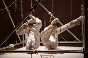 Köied, millesse duo end köidab, äratavad taas objektsuseihalusega mängimise aistingu. Kõik paistab liikuvat nagu Ulrich Seidi dokumentaalfilmis „Im Keller”, milles avanevad austerlaste keldrites peidus olnud obsessioonid, fetišid ja muu moraalselt kaheldav. Kas nüüd on Paide kord? Aga ei. Avanesid hoopis eesriided ja uued ruumitasandid. Köitesse põimitud etendajad muutusid ise objektideks, trotsisid gravitatsioonivälja. Justkui langevari, mis etenduse alguses avanes, jäädi kõikuma nelja tuule kätte. Vaikselt ja mitte kuhugi viivalt.