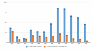 Mida räägivad meie lõpetajate saatusest aga EFA andmed? Kõigepealt vaatasime tudengite osaluskordi filmides. Me ei eristanud filmide liike, žanreid ega pikkust, arvesse läksid kõik EFA filmikirjed. Kuigi kolm dokumentaalfilmi režissöörina on midagi muud kui üks täispikk mängufilm tootmisassistendina, ei olnud meie eesmärk vaadata spetsiifilisi juhtumeid, vaid näha, kas on mingid üldised 30 aasta jooksul välja joonistuvad trendid, mida analüüsida, kõrvutades neid Eesti filmitööstuse arengutega.