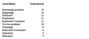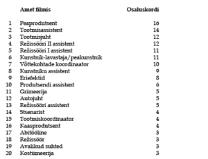 Vaatasime ka osalemist teistes ametites lisaks põhierialale, nägemaks, kas vilistlased liiguvad edasi nii, nagu õppekava on planeeritud. Sisseastujatele rõhutame alati, et lõpetades ei saa neist kohe oma eriala esindajaid, vaid nad sisenevad õpipoisi-meistri süsteemi ja hakkavad oma õpitud eriala meeskonnas assisteerima. Tabel joonisel 10, mis näitab produktsiooni eriala lõpetanute osalemist teistes ametites, demonstreerib, et alates esimesest selle eriala vastuvõtust produktsiooniõpet juhtinud Anneli Ahvena töö mängib Eesti filmitööstuse struktuurses ülesehitamises olulist rolli. Esikahekümnest on tervelt kolmteist produktsiooniosakonda kuuluvad ametid. See on oluline näitaja filmikooli ja filmivaldkonna sümbiootilise suhte kohta, kuna tööstus ei koosne ainult kuuest-seitsmest põhi­erialast ega püsi ainult neil, samuti ei suuda Eesti-suuruse riigi tööstus võtta iga kahe aasta tagant vastu ligi nelikümmend oma erialale spetsialiseerunud filmitegijat. Selleks, et noored valdkonda jääksid ja ka valdkond ise püsiks ja areneks, on tähtis terve pealekasv, kes ei asu kohe kõige vastutusrikkamatesse ametitesse, vaid saab oma esimesed kogemused õpitud erialal assistendiametis.