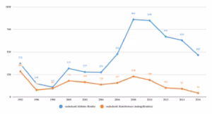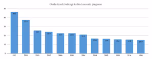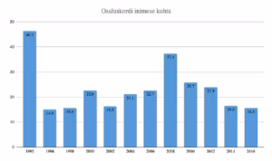 Näha on ühtlaselt tõusev trend ja siksakid selle trendi sees (mis lisaks muudele faktoritele peegeldab tõenäoliselt ka õppekava vastuvõttu iga kahe aasta tagant). Osakaal on saavutanud stabiilsuse umbes kümme aastat tagasi ja peegeldab kogu Eesti filmitööstuse üldisemat trendi (joonis 14). Alates nullindate keskpaigast on  üle poole Eestis toodetavatest filmidest tehtud püsivalt ja ühtlaselt filmikunsti eriala vilistlaste osalusega.