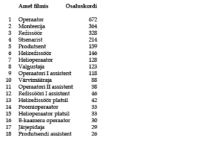 Sellest tabelist ei peaks muidugi üheselt järelduma, et lõpetanutest saavad kõige rohkem tööd operaatorid. Väga paljudel operaatoritel kasvab filmograafia tänu dokkidele (vahel filmib operaator mitmekümnest võttepäevast paar tükki, kuid läheb ikka operaatorina kirja — sellist ametialast iseärasust näiteks monteerijatel pole) ja tänu operaatorimeeskonna ametitele, nagu näiteks valgustaja või steadicam’i operaator (kellena võidakse ka töötada väike arv päevi pikast võtteperioodist, kuid nimi läheb tiitritesse kirja). Seega võib naljaga pooleks öelda, et operaatori eriala iseärasuseks on võimalus kasvatada EFA andmebaasi kvantiteeti. Sellele vaatamata võib tõdeda, et operaatori erialalt tulevad lõpetajad saavad filmitööstuses kiiresti rakendust ja töötavad palju ka üksteise filmide juures. Näiteks on mitmed operaatori eriala lõpetanud oma kursuse- või õppekavakaaslastest operaatoritele kas värvimäärajateks, valgusmeistriteks või B-kaamera operaatoriteks — kuna juba tudengifilmide tegemise ajal moodustatakse operaatorimeeskondi kollektiivselt (erinevalt üsna üksinda töötavast stsenaristist ja monteerijast, kes küll töötavad palju režissööride ja produtsentidega, kuid oma erialagrupi sees meeskondi ei moodusta). Sellel operaatori ameti eripäral on nii eeliseid kui puudusi. Eelis on see, et jala ukse vahele saab kiiresti ja kui vähegi jaksu on, siis tööd jätkub. Puuduseks on aga erialane „liminaalne tsoon”, milles nad töötavad sageli kas assistentide või valgustajatena, kuigi sooviksid saada operaatoritöö pakkumisi. Mida paremaks inimene teises ametis muutub, seda rohkem pakutakse talle just seda ja vähem operaatoritööd. Mingil hetkel teeb ta otsuse, kas saada näiteks väga heaks valgusmeistriks või loobuda sellest ja hakata end operaatorina „sisse sööma”, tehes väiksemaid projekte, sageli praktiliselt tasuta. Seda, miks viimane valik on raske, ilmestab ehk ka järgmine joonis Eesti filmitootjate tööturu küsimustikust.