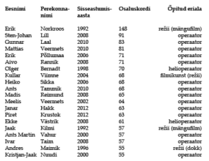 Vaadates edasist pingerida joonisel 7, on näha, et see on väga tugevalt operaatori- ja helimeeskondade alaametite poole kaldu. Kui vaatasime numbrite taga nimede nägemiseks summeeritud pingerida joonisel 8 (milles ei ole eristatud erialasid ja kus läheb arvesse ka nt see, kui inimene on esinenud tiitrites näitlejana), hakkas silma tõeliselt silmipimestav operaatorite plejaad. Esikahekümnes on lausa 14(!) operaatori erialal õppinut. Lisaks ka kaks inimest, kes töötavad valdavalt operaatorina — näiteks juhib pingerida mängufilmi režiid õppinud Erik Norkroos, kellel on lisaks tervele hulgale töödele produtsendi, monteerija ja režissöörina kõige rohkem kirjeid operaatorina15; samuti Kullar Viimne, kelle filmograafias domineerib operaatoritöö. Tabel näitab ka, et operaatori eriala lõpetanuid ootab tööturule minnes kohe suur hõive, sest esikahekümnes on ka üsna värskeid, näiteks 2012. aasta lennu lõpetanuid.16 Lisaks veel kaks heli eriala lõpetanut, Olger Bernardt ja Ekke Västrik, ja kaks režissööri, produktiivsusega silma paistvad Jaak Kilmi ja Andres Maimik, keda ei ole sellesse pingeritta toonud mitte ainult režissöörina tehtud filmid, vaid terve hulk muid ameteid, sh produtsent.