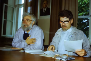 „Keelemässaja”, 2022. Enn Põldroos ja Mati Hint. Seinalt seirab neid Mihhail Gorbatšov.