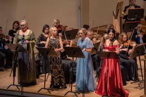 Giuseppe Verdi ooperi „Falstaff” kontsertettekanne Estonia kotserdisaalis 5. XI 2022. Solistid (vasakult): Maria Streiffert, Helen Lokuta, Elena Bražnik ja Ani Yorentz.