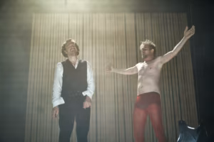 Ainus päris inimene selles seltskonnas on Oswald (Miloslav König), valges kostüümis ja veritseva südamega rinnal, habras ja nõrk, algusest peale hukule määratud. Kõik ülejäänud tegelased pakatavad elujõust ja on hõivatud oma asjadega; neil pole noore mehe jaoks aega, ainult ema, kes teab Regina sünni saladust, kardab, et tema poeg võib astuda oma poolõega verepilastuslikku suhtesse. Muusika ja valgus rõhutavad Alvingu majas toimuva kummituslikkust ja müstilisust. Lõpustseenis ristuvad prožektorite kiired, koondudes õnnetule Oswaldile. Tema haigus on tunduvalt hävitavam, kui Ibsen seda väljendab, isegi ta riided lämmatavad teda. Viimases stseenis tõmmatakse Oswaldile selga rippuvate genitaalidega valge trikoo, nagu alasti ja kannatava hinge metafoor.