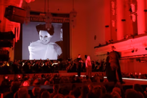 Orkester, tõsi küll, paikneb kontserdisaalis samal positsioonil nagu ikka, konterdisaali lava lava mõjub ses suhtes rahustavalt, annab tunde, et maailm on ikka niisugune nagu alati. Et elus on ka midagi kindlat. Näitelava aga on toodud publiku keskele ja selle paigutus on suurepärane: iga vaataja saab tänu sellele võimaluse näha mõnd stseeni lähivaates, kaugemal toimuvat aga saab jälgida orkestri taga paiknevalt suurelt ekraanilt. Ka näitlejate liikumiseks annab lava häid võimalusi (ja liigutakse lavastuses palju, aga sellest edaspidi). Peale lavapinna, mis toob oma laotuse ja seal toimuvaga tahes-tahtmata ajuti meelde moedemonstratsioonid, ongi põhiliseks kujunduselemendiks suur ekraan, millel näidatakse peamiselt näitlejat, suures plaanis ja reaalajas. Julgen pakkuda, et see on üks neid knihve, mille abil lavastus on nii paljudele naha alla pugenud. Eriti tähenduslikel hetkedel näeb sel ekraanil aga värvi, lihtsalt värvi: valget, punast.