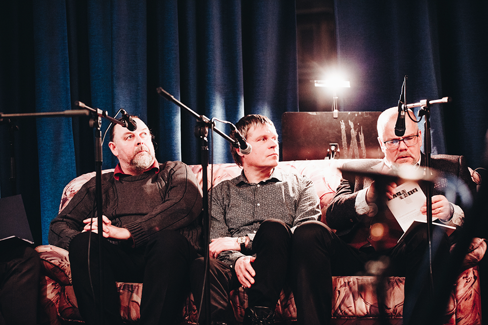 Vestlusringi liikmed Donald Tomberg, Hasso Krull ja Arne Merilai kõnelemas Artur Alliksaare, Anton Hansen Tammsaare ja Ilmar Laabani tekstide musikaalsusest.