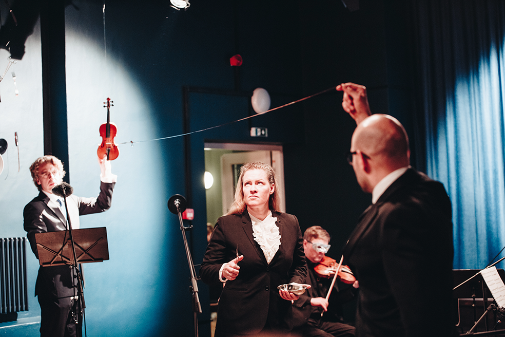Lõpustseen instrumentaalteatri uudisteose „KONTSERT — kelle konts see tallab õhule sisse kortse ja tertse?” lavastatud ettekandest. Osatäitjad (vasakult): Priit Volmer, Iris Oja ja Rasmus Kull, viiulil Harry Traksmann.