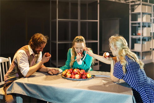 Kodu on „Metamorfoosis” hubasuse ja soojuse asemel metalne, värvitu, külm ja kõle. Ainsa kirka tooni annavad lavale erkpunased õunad, mis asetsevad vaagnal ja kandikutel, riiulitel ja põrandal. Õunad muutuvad justkui omaette kujundlikeks tegelasteks, kandes ühtaegu nii esmast realistlikku kui ka piibellik-sümboolset olemust — nad veerevad, peatuvad, purskuvad, meelitavad, tõukavad, armastavad, vihkavad, ravivad ja samas hävitavad. Õunad ja ilmetud plastkandikud, millel neid kantakse ning mida vastu põrandat lüües imiteerivad näitlejad ka rongi liikumise helisid, lisavad lavastusele objektiteatri omadusi, milles Taavi Tõnisson on lavastajana tugev. Nukke seekord laval pole ning Rakveres pole ka õppinud nukunäitlejaid, kuid kui grupp tõstab peategelase esmalt hooga üle üksteise peade ning seejärel köögilauale, toob see mällu sarnase nukuliigutamise Tõnissoni menulavastuses „Ronja”.
