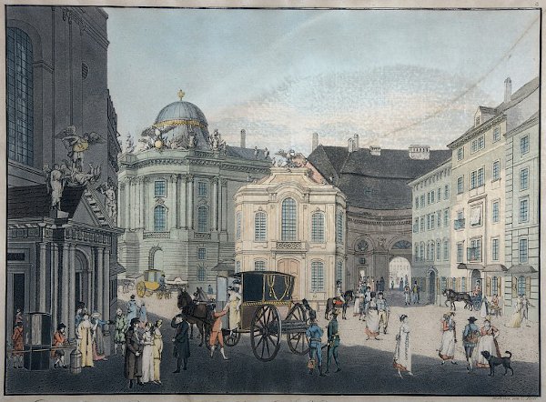 Vaade Viini Michaelerplatzile ja Burgtheateri vanale hoonele (keskel) ühel 19. sajandi alguse gravüüril.