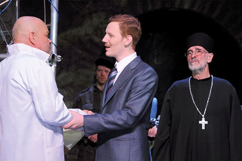 David Edgar, „Nelipühad”. Lavastaja Mladen Kiselov. Oliver Davenport — Ain Lutsepp, Sõdur — Mihkel Kabel, Mihhail Czaba — Hendrik Toompere jr ja Isa Sergei Bojovic — Lembit Ulfsak. Esietendus 6. V 2012 Eesti Draamateatri suures saalis.