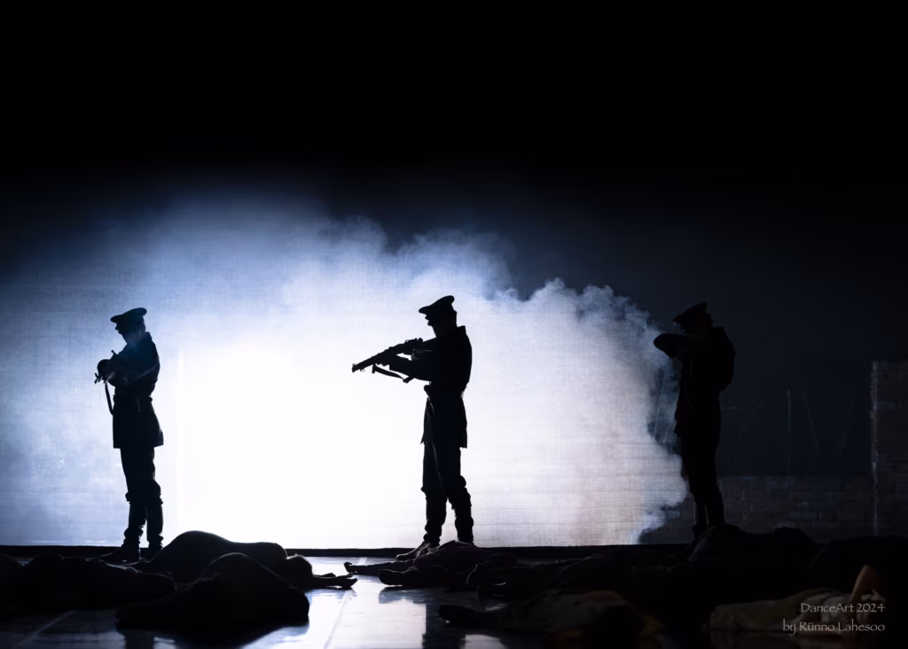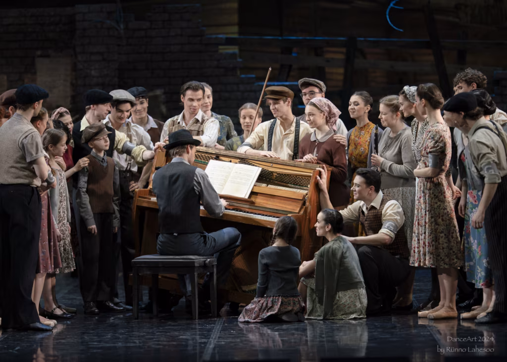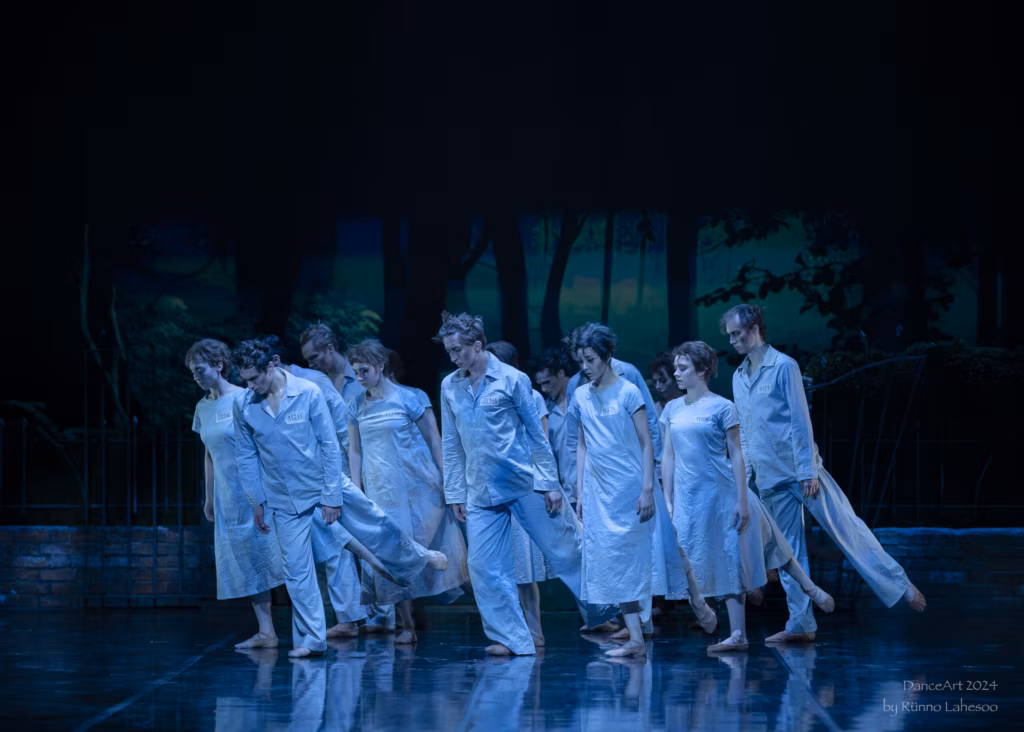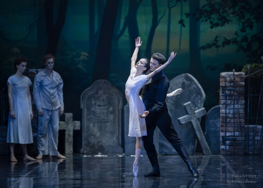Michael Pinki „Giselle”. Eesti Rahvusballett, 2024. Giselle — Laura Maya Rosiers, getokogukond ja okupatsiooniarmee ohvitser.Taga keskel Giselle’i ema — Anna Roberta ja Hilarion — Jevgeni Grib.