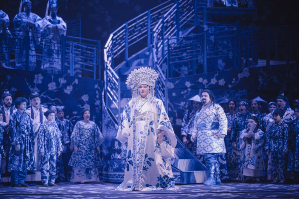 Giacomo Puccini/Franco Alfano ooper „Turandot”. Teater Vanemuine, 2024. Turandot — Aile Assonyi ja Calàf — Kristian Benedikt ning ooperikoor.