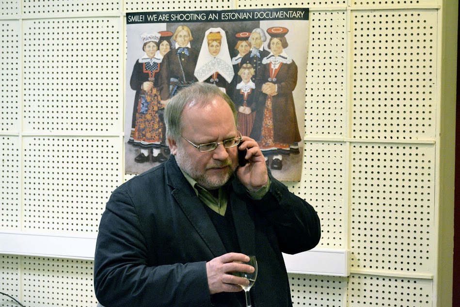 Projektijuht Jaak veiniklaasi ja telefoniga. Eesti Film 100 kodune lõpetamine 12. detsembril 2012. Rein Kasaku foto