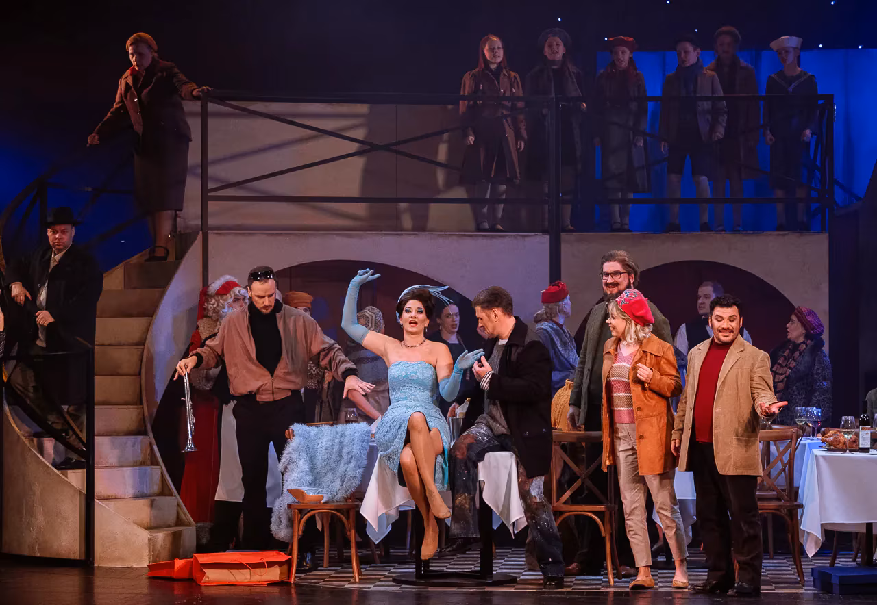 Giacomo Puccini ooper „Boheem”. Vanemuine, 2025. Stseen Café Momus’s: ees keskel Schaunard — Raiko Raalik, Musetta — Kadri Kõrvek, Marcello — Jānis Apeinis, Colline — Märt Jakobson, Mimì — Mirjam Mesak, Rodolfo — Gabriele Mangione.