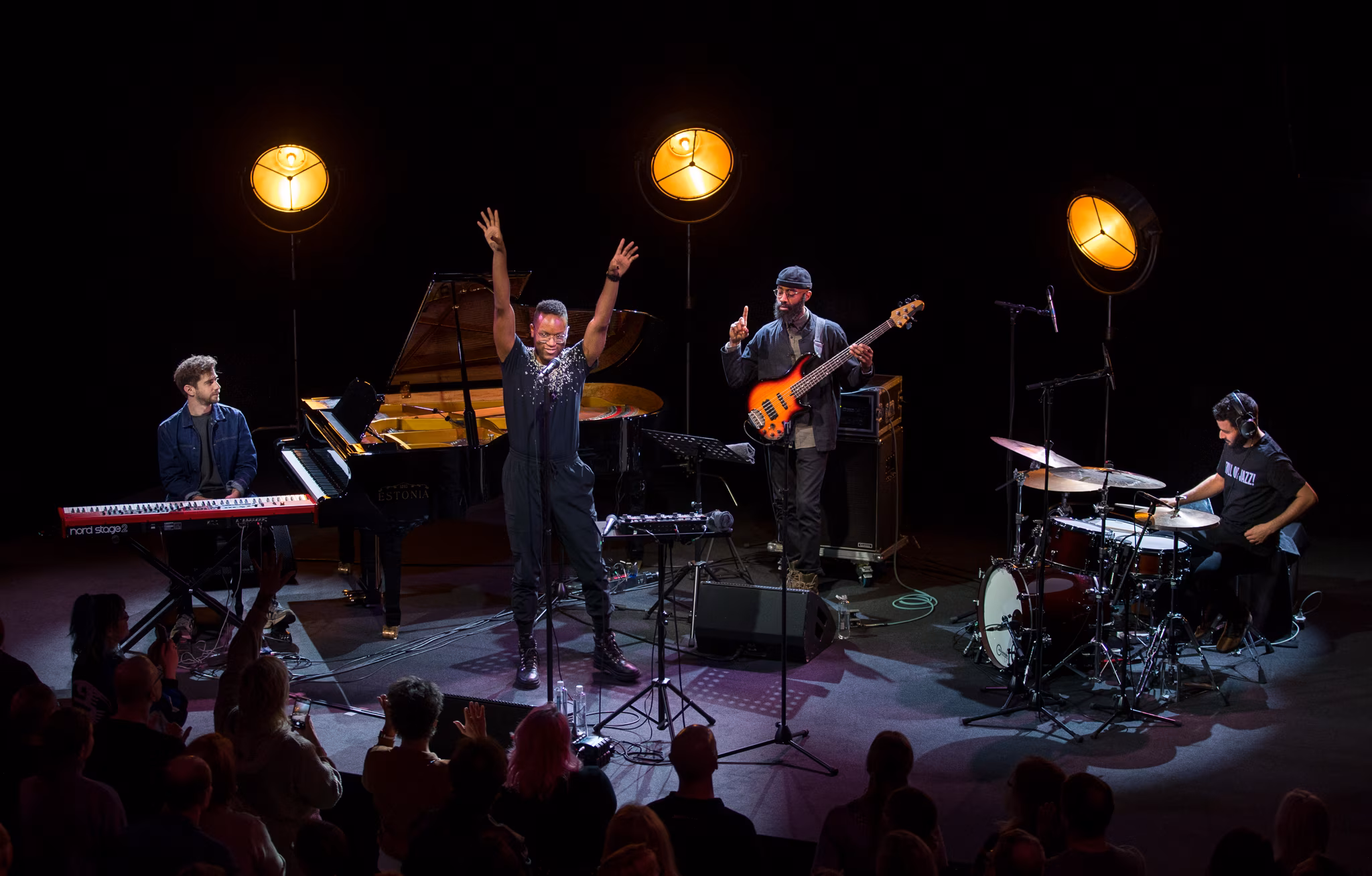 Prantsuse kvinteti Poetic Ways debüüt toimus neli aastat tagasi Marseille’ konservatooriumis. See õnnestus sedavõrd, et kohe hakkas neile saabuma kutseid festivalidele. Nende kava koosnes tuntud prantsuse poeetide tekstidele loodud šansoonidest, mis erinevad vägagi meil levinud šansooni ehk „laulu” mõistest ja olid ehtdžässilikult lahendatud. Seda aitas esile tuua muusikute hea omavaheline klapp ja muidugi nende solisti Célia Kameni hääl. Célia on muide võitnud 2021. aastal prantsuse kõrgeima džässiauhinna Victoires du Jazz. Kava sidus mõnusaks tervikuks saksofonist Raphaël Imbert oma humoorikate vahetekstide ja stiilsete vahemängudega. Kogu bändi Poetic Ways seltskond vääriks eraldi kiitust, kuna nii heal tasemel ja ideaalse üksteisemõistmisega ansamblit kuuleb üliharva. Kahjuks ei saanud ma kusagilt teada, kes oli nende fantastiliste seadete autor ja bändiliider. Nii pianist Pierre-François Blanchard, Pierre Fénichel kontrabassil kui Pierre-François Dufour trummidel, rääkimata saksofonist Raphaël Imbert’ist, hiilgasid stiilsete (kuid mitte tüüpiliste) soolodega kogu dünaamilise skaala ulatuses. Siinkohal tahaksin eraldi tunnustada helimeistrit (kes sel korral vääris tõesti oma tiitlit!) Kaur Kenki, kes kogu selle dünaamilise mitmekesisuse nautimise võimalikuks tegi. Veel üks festivali