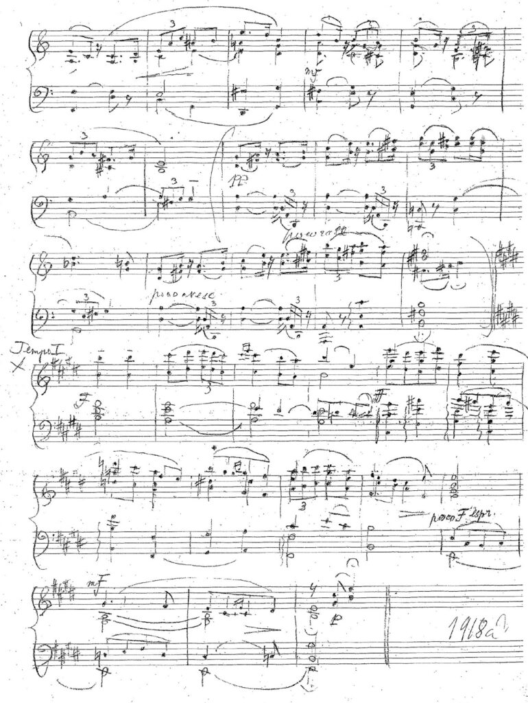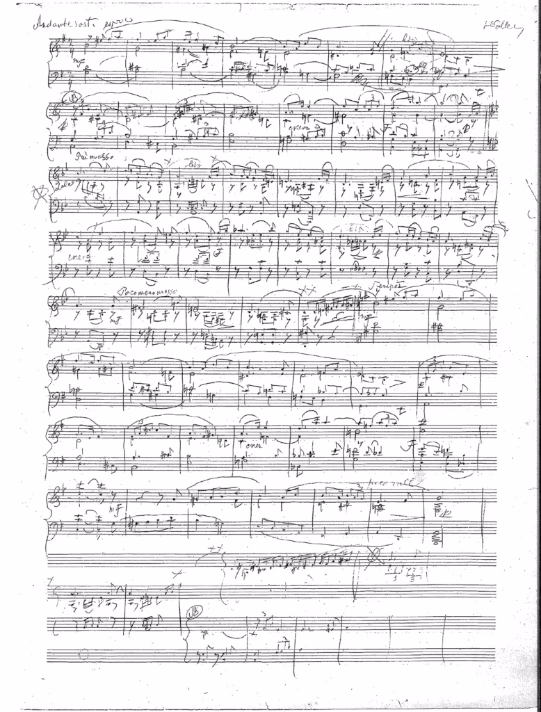 Näide 3 esitab faksiimile kujul ainsa säilinud käsikirja27 arvatavasti 1910. aastate lõpust pärinevast dateerimata klaveripalast „Andante sostenuto G-duur”, mis võis olla varaseim kolmest Heljo Sepa poolt pealkirjastatud „Kodumaisest viisist”.28 See käsikiri — hilisemate parandustega mustand — on viiest 1919. aastal loodud ja 1960. aastal redigeeritud pala „Moderato sostenuto h-moll” käsikirjast varaseima tagaküljel. Nimetatud käsikiri pärineb arvatavasti 30.–40. aastaist. Võimalik, et kõnesoleva pala puhtalt ümber kirjutatud lõppvariant (võib-olla koos mustandis puuduva daatumiga) on kaotsi läinud. Kui ma seda pala (tõenäoliselt 2006. aastal) Heljo Sepale tutvustasin ja küsisin, kas see võis olla „Kodumaine viis” G-duur, vastas ta, et ehk võis, aga kindlalt ta enam ei mäletanud.