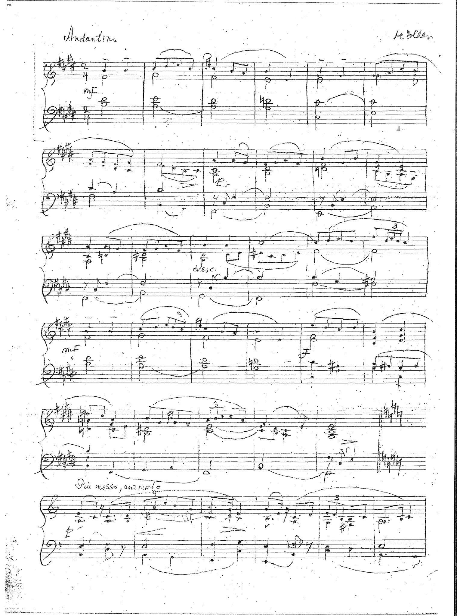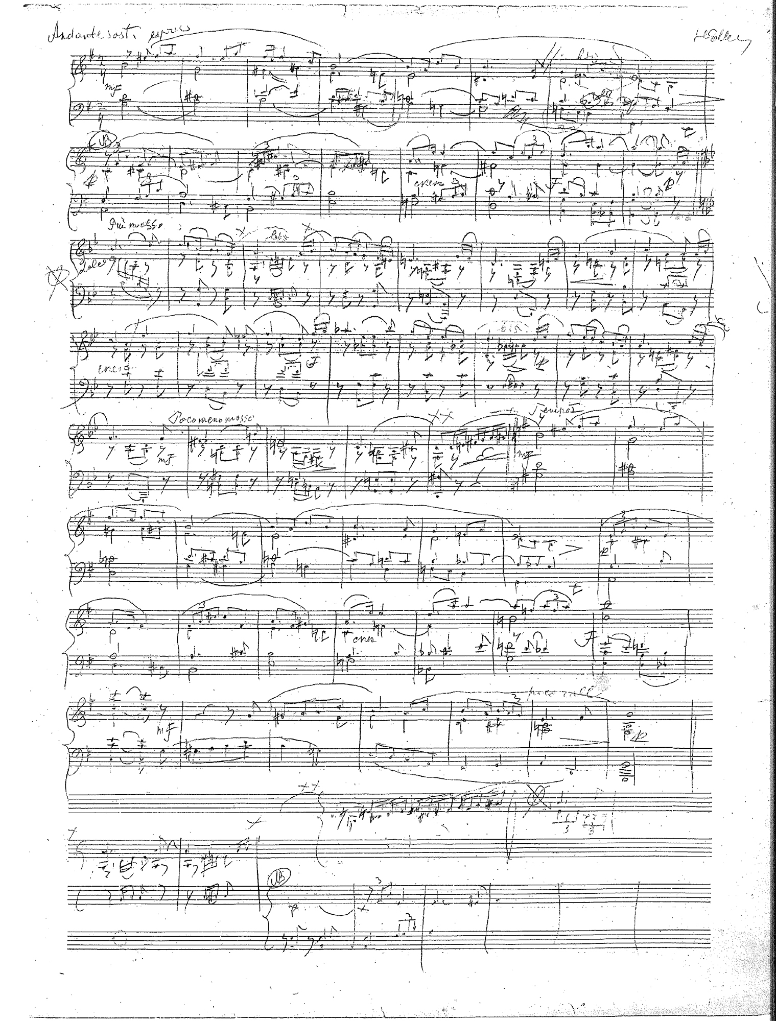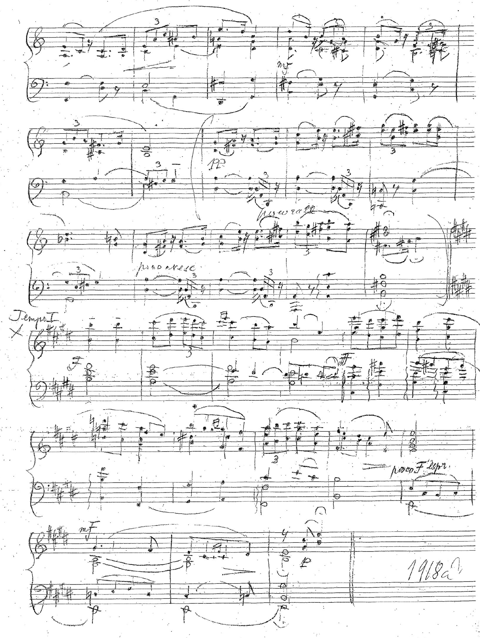 Näide 3 esitab faksiimile kujul ainsa säilinud käsikirja27 arvatavasti 1910. aastate lõpust pärinevast dateerimata klaveripalast „Andante sostenuto G-duur”, mis võis olla varaseim kolmest Heljo Sepa poolt pealkirjastatud „Kodumaisest viisist”.28 See käsikiri — hilisemate parandustega mustand — on viiest 1919. aastal loodud ja 1960. aastal redigeeritud pala „Moderato sostenuto h-moll” käsikirjast varaseima tagaküljel. Nimetatud käsikiri pärineb arvatavasti 30.–40. aastaist. Võimalik, et kõnesoleva pala puhtalt ümber kirjutatud lõppvariant (võib-olla koos mustandis puuduva daatumiga) on kaotsi läinud. Kui ma seda pala (tõenäoliselt 2006. aastal) Heljo Sepale tutvustasin ja küsisin, kas see võis olla „Kodumaine viis” G-duur, vastas ta, et ehk võis, aga kindlalt ta enam ei mäletanud.