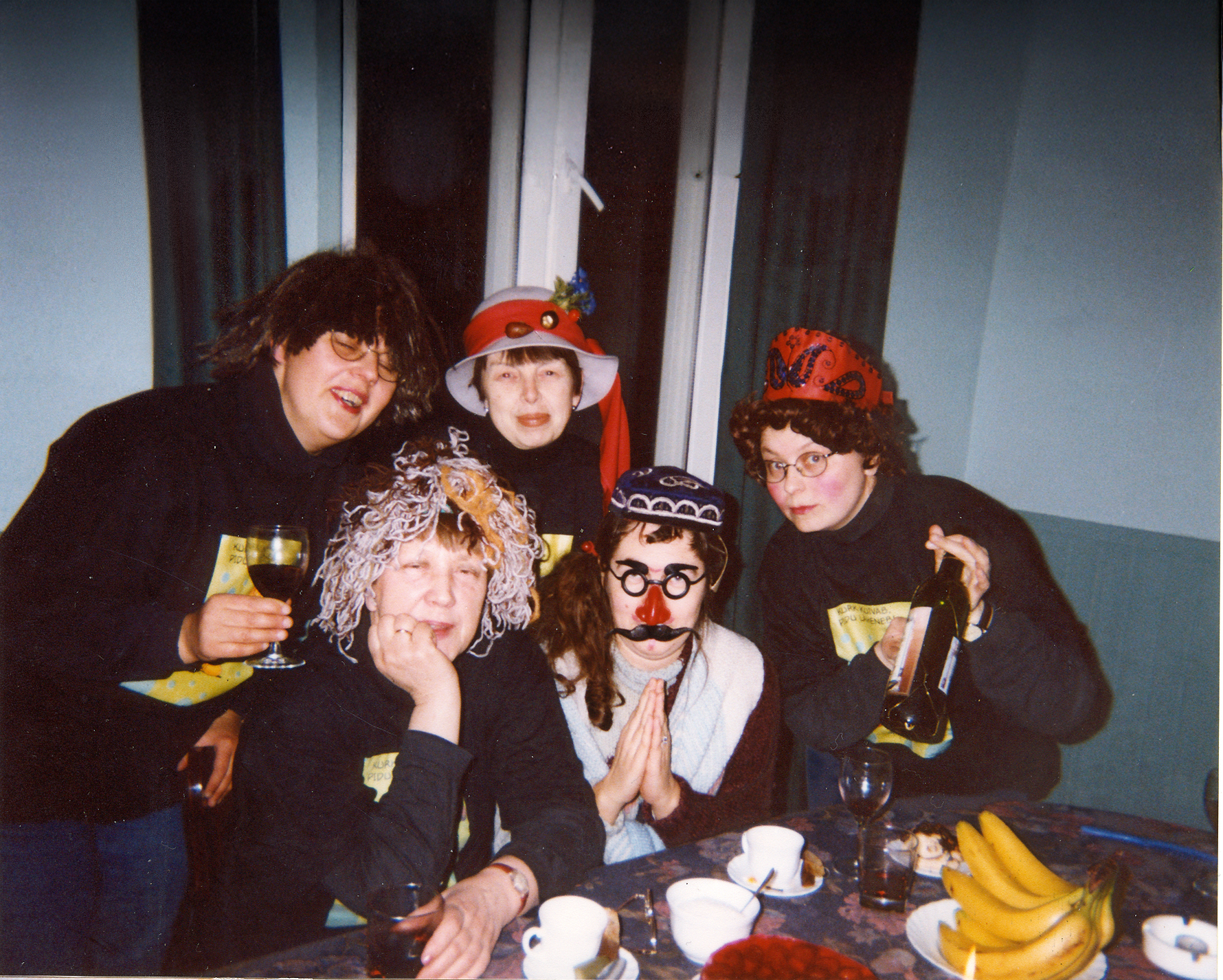 Rõõmsal meelel! Puhta suuga! Oli kord Eesti Raadio kultuuritoimetus — parim kooslus mu toimetajateel. Vasakult: Maris Johannes, Mari Tuulik, Mari Tarand, Pille-Riin Purje, Külli Tüli, 1999.